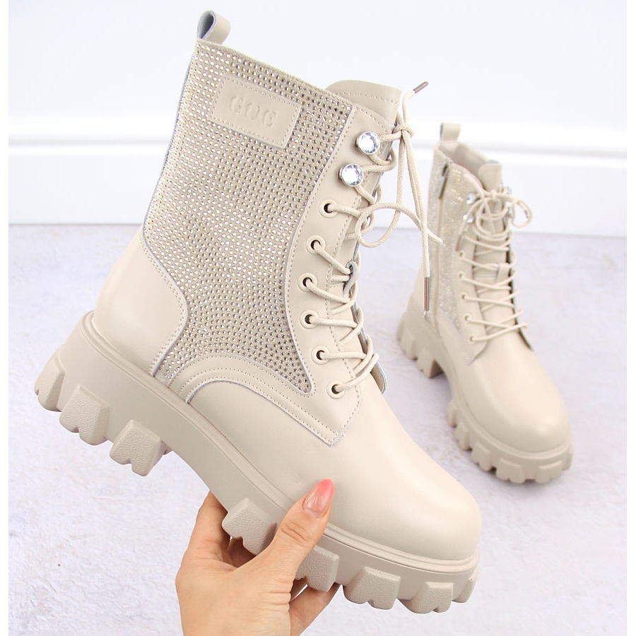Details: Women's leather ankle boots with zircons beige Goe OO2N4108