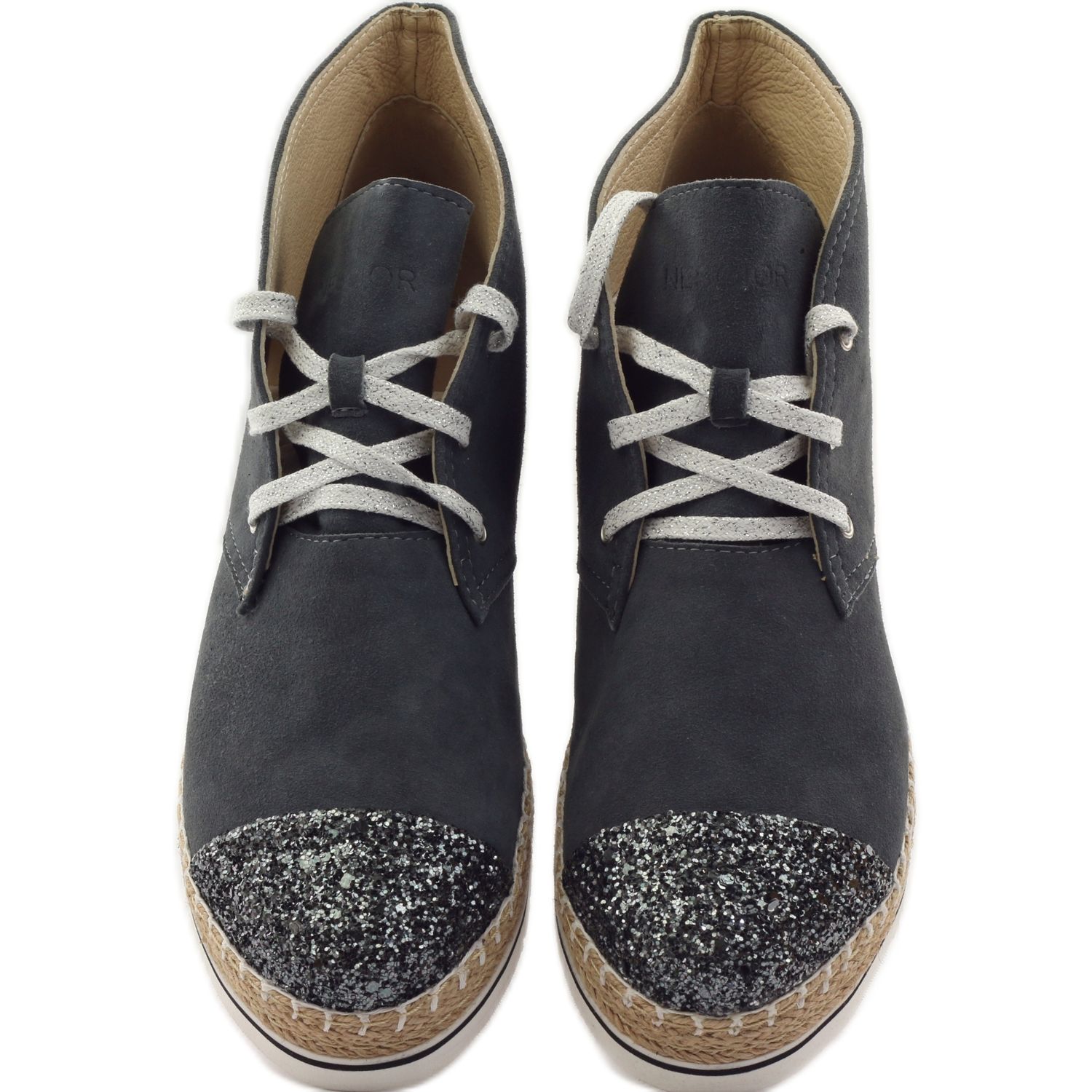 Model 098-B in a shade of dark gray with a glitter accent on the tips, which attracts attention and gives every styling an elegant character. The round, slightly elongated toe and lace-up fastening ensure not only an aesthetic appearance, but also stability and comfort of wearing. The use of natural leather as the outer material and natural leather as the insert ensures comfort throughout the day.
