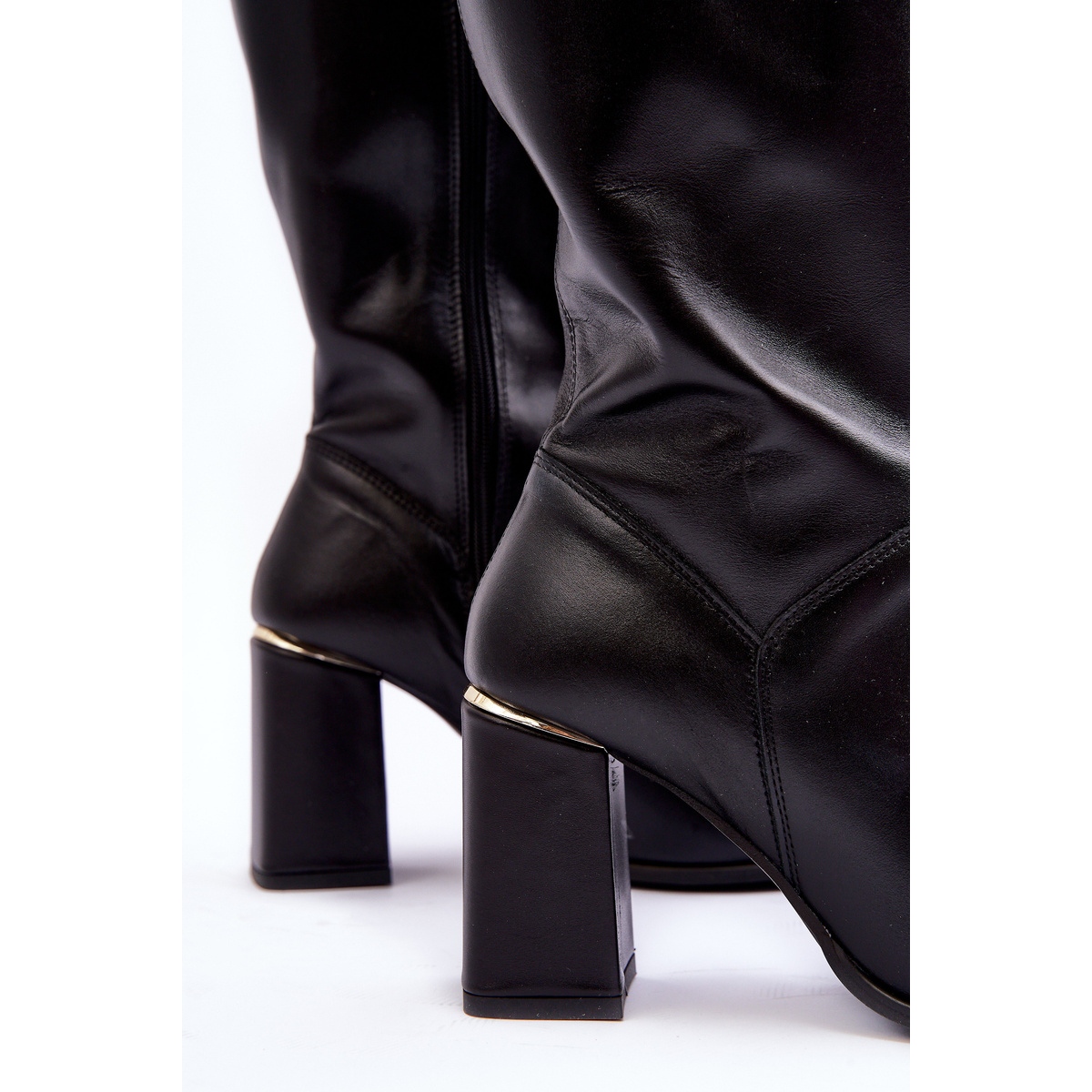Elegant, classic knee boots made of high quality natural leather in a matte, deep black color. The model was set on a stable bar heel with a decorative, mirror element - a subtle detail that adds character. The noses in the spitz optically slim the figure, and the stiffened heel ensures better fit and comfort of walking.