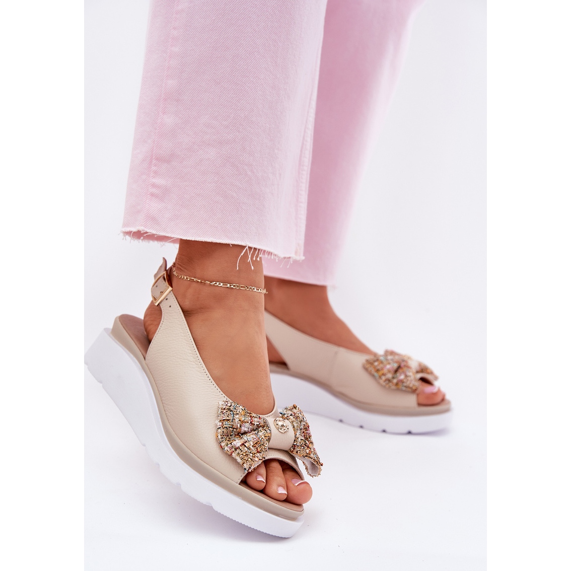 Details: Women's leather sandals with a wedge with a Zazoo 1882 beige bow