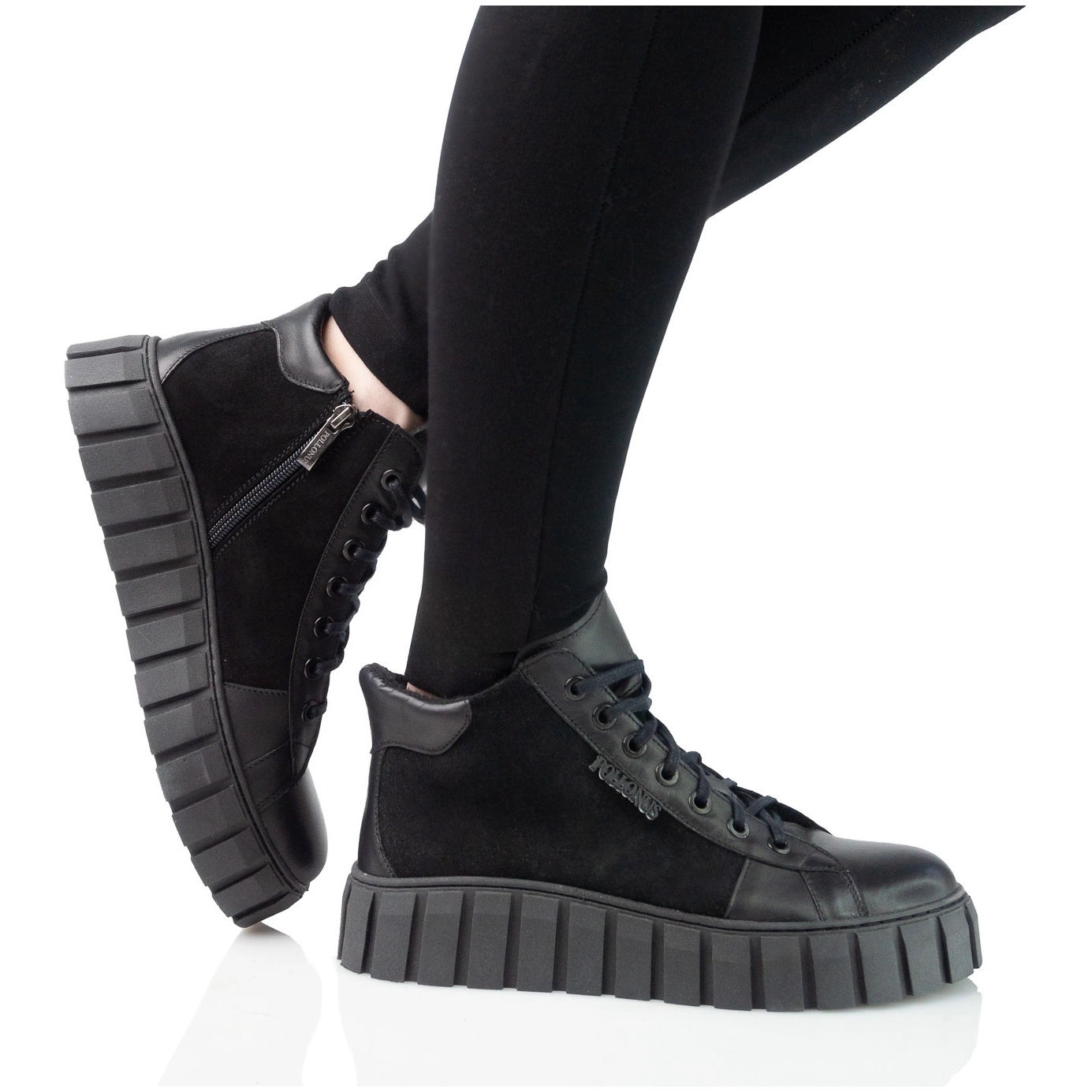 Women's high leather sneakers Pollonus-model 5-1575-004 in an elegant black color is a great choice for women who value both style and comfort. These insulated boots combine modern design with high quality materials, which makes them perfect for cooler days.