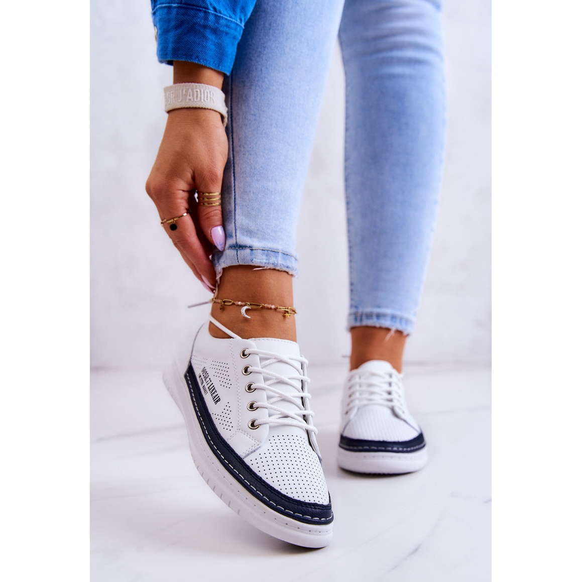 Classic low-cut sneakers are a must-have every summer and spring wardrobe. The model made of soft, natural leather with openwork perforation provides excellent ventilation and comfort of wearing all day. Thanks to the leather insert, the shoes are pleasant to the feet, and the light, synthetic sole guarantees good cushioning and durability. Locking for round shoelaces allows for a perfect fit, and the timeless white and navy blue design fits perfectly with jeans, shorts or dresses.