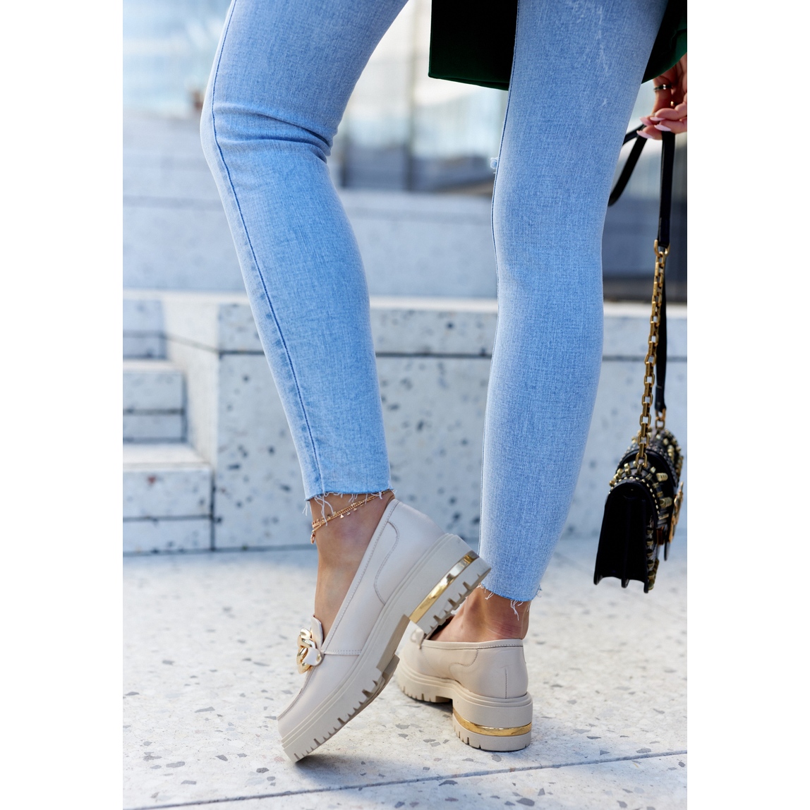 The unique pattern and decorative chain add a noble character, perfectly emphasizing any styling. The high sole and flat heel guarantee comfort while subtly lifting the silhouette.