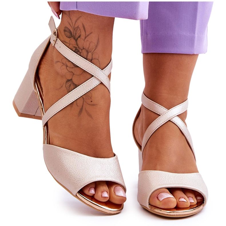 The sandals are characterized by straps crossing in the middle, which not only attract attention but also stabilize the foot. The low heel in the form of a 6.5 cm high post ensures comfort of wearing, and the open, rounded toe adds lightness and freedom. The stiffened heel and adjustable strap with a buckle guarantee a perfect fit to the ankle, making them an ideal choice for various types of parties, celebrations or meetings with friends.
