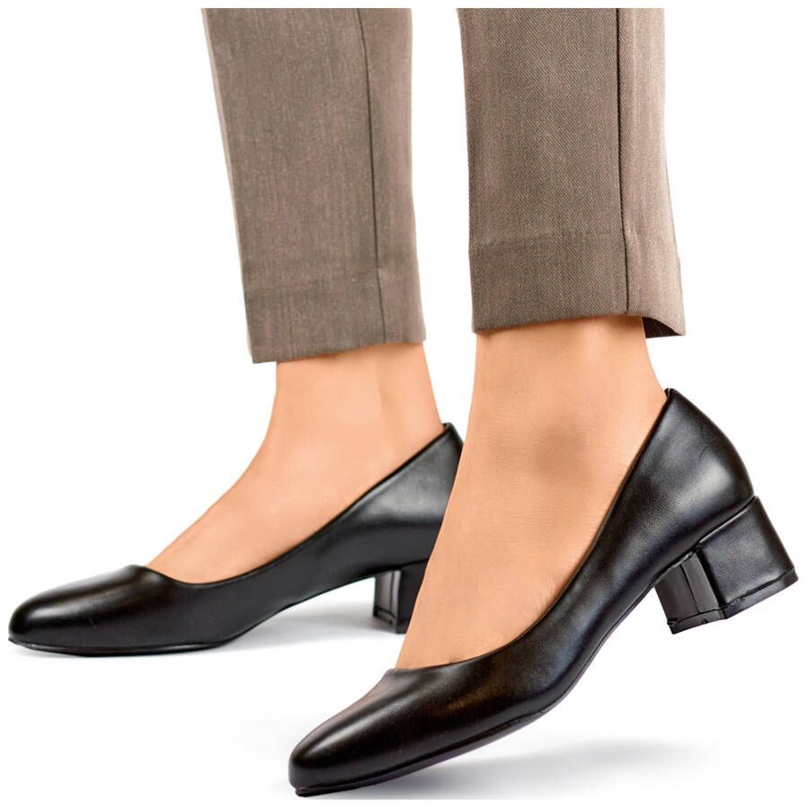This model is characterized by a low heel in the shape of a 4 cm high block, which ensures comfort of wearing all day. The round nose adds subtlety, and the inserted cut allows easy putting on and taking off shoes. Ecological outer skin in a timeless black color makes these pumps perfectly blend in with most styles.