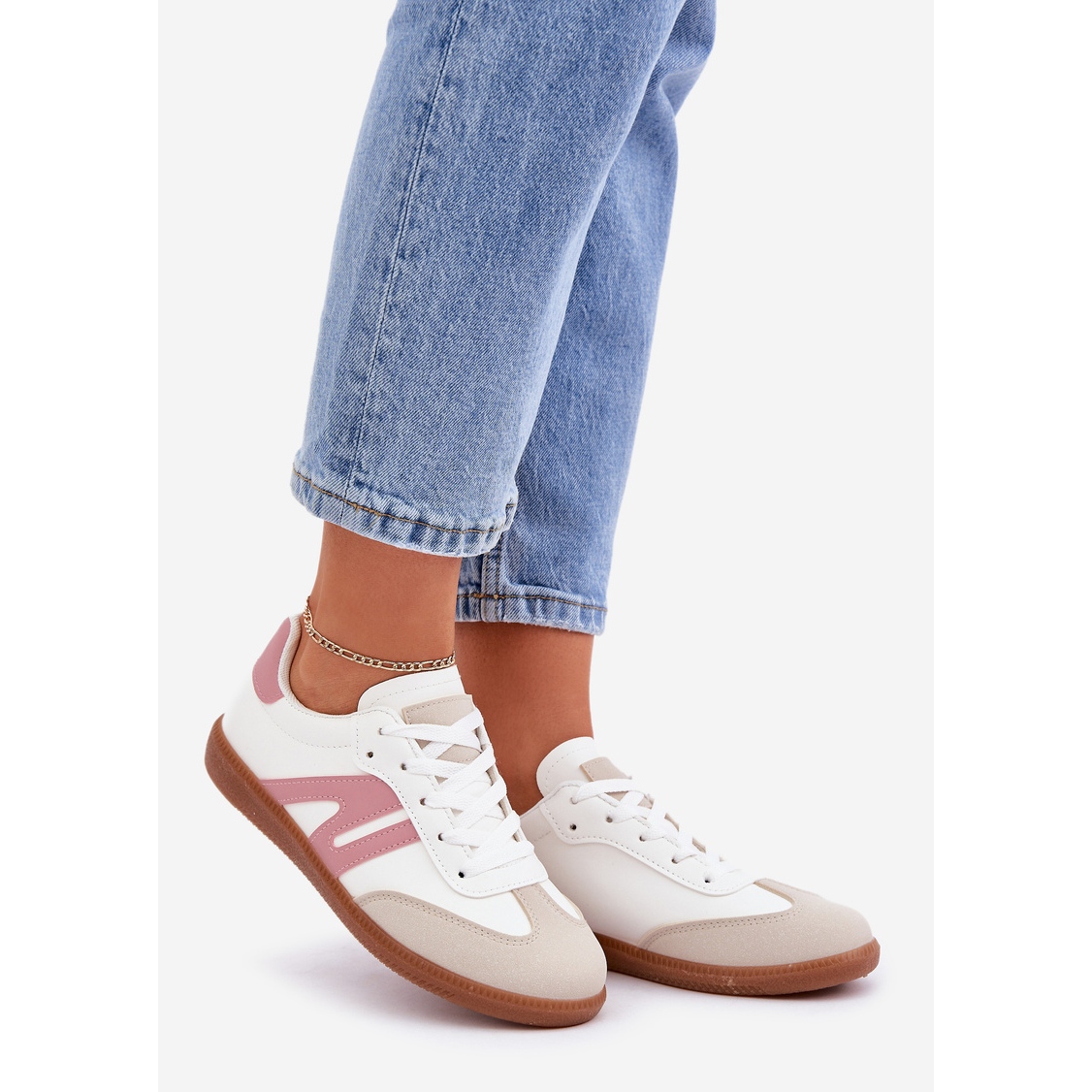 We present low women's eco sneakers in white and pink navidmi, which combine comfort and fashionable design. Made of high quality eco leather, these sneakers are characterized by a low upper, which makes them the perfect choice on a daily basis. Classic lacing allows for a perfect fit to the foot, and the rounded noses give them a universal character.