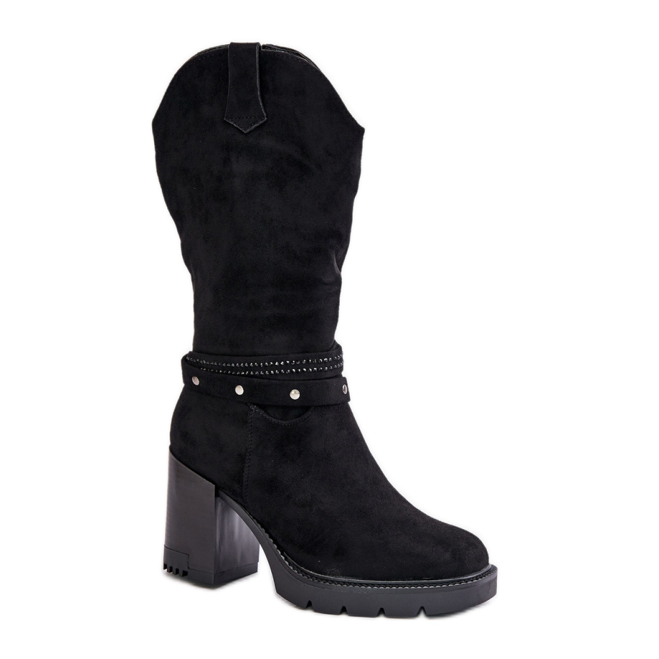 The 31 cm high upper is elegantly decorated with two intertwining stripes and rhinestones, which gives them a unique character. The round nose adds subtlety, and their universal black color makes them match many styles - both casual and more elegant.