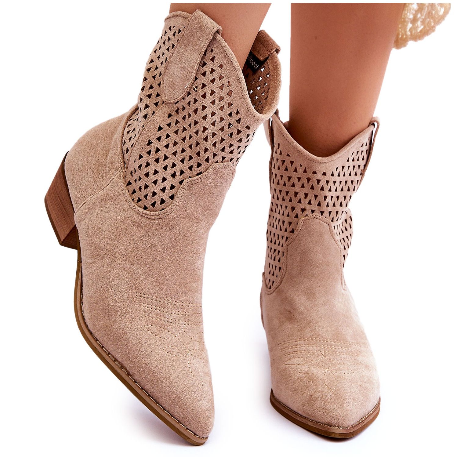 Women's Openwork Cowboy Boots Beige Reeds are the perfect choice for women who value style and comfort. Made of ecological suede, these boots combine modern design with classic cowboy rebellion. The openwork pattern gives them lightness, and the stiffened heel makes the foot firmly planted.