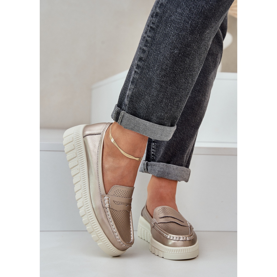 We present leather women's leather loafers on the platform and champagne - golden wedges, which are an ideal combination of elegance and comfort. Made of high quality natural leather, these loafers exude a classic style, which perfectly fits in with spring-summer trends.
