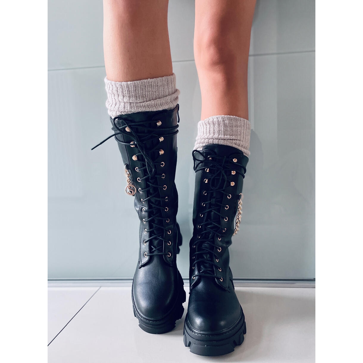 We present the BM Totah Black women's riding boots - an ideal proposition for women who want to combine fashionable design with comfort. These lace-up boots with a high sole are distinguished not only by their modern design, but also by a stylish gold chain that adds elegance and character.