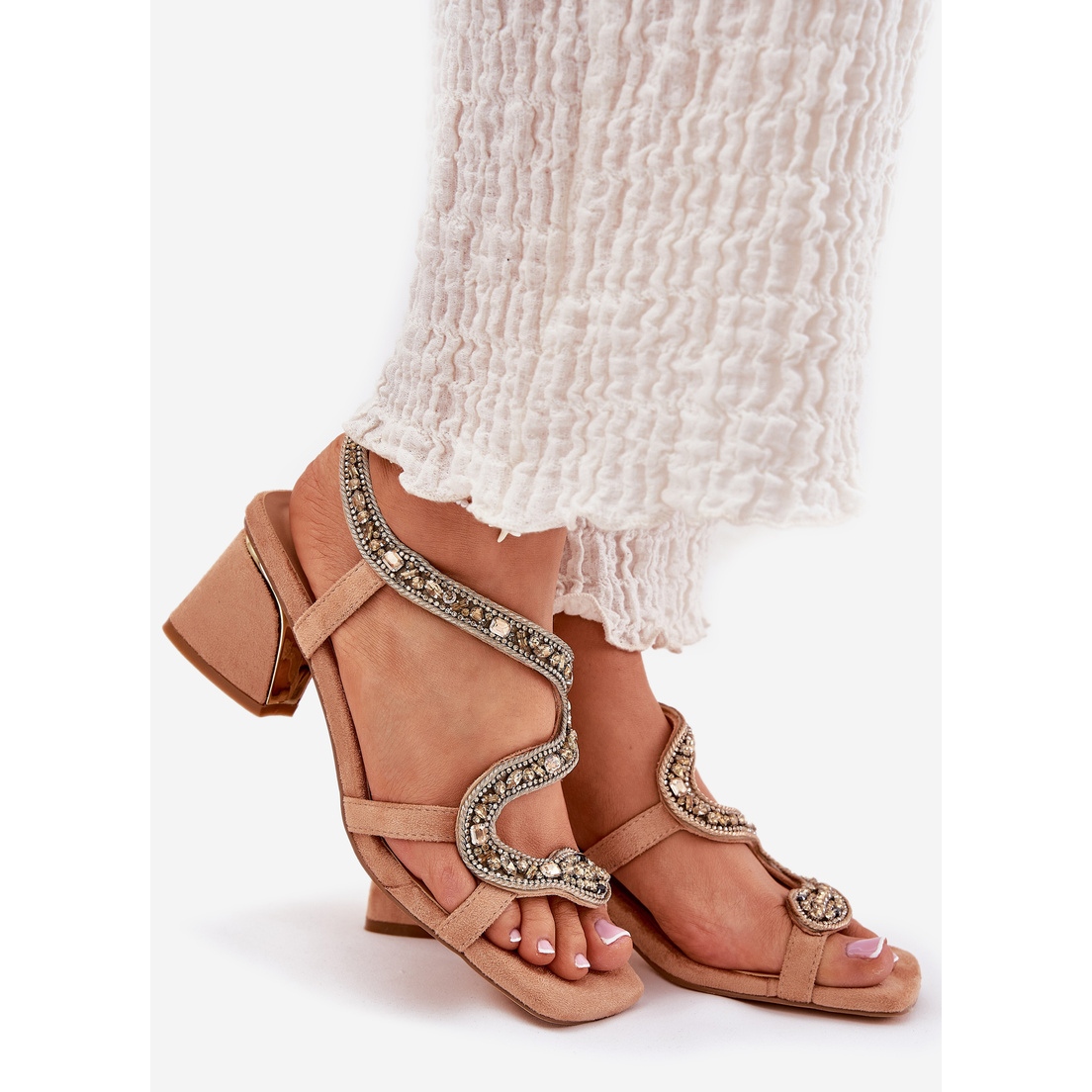 Women's sandals on a post with ARTIKER 56C1374 crystals in beige is a great choice for women who want to combine elegance with fashionable style. Made of high quality eco suede, these sandals are distinguished by an attractive, post -heel with a mirror element that gives them style.