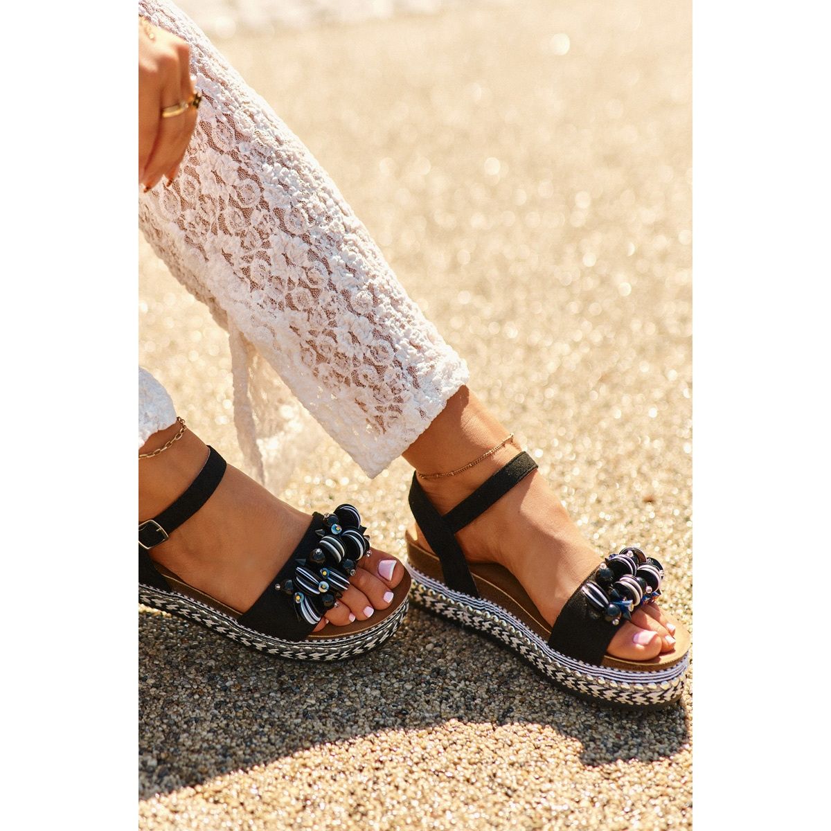 Set on a spectacular, decorated platform with a height of 3.5 cm and a delicate wedge, sandals provide excellent stability and comfort during each step. The adjustable strap with the buckle allows you to perfectly match each foot, which makes them not only fashionable, but also functional. In addition, decorative details on the front bar give them a unique character, which will certainly attract attention.