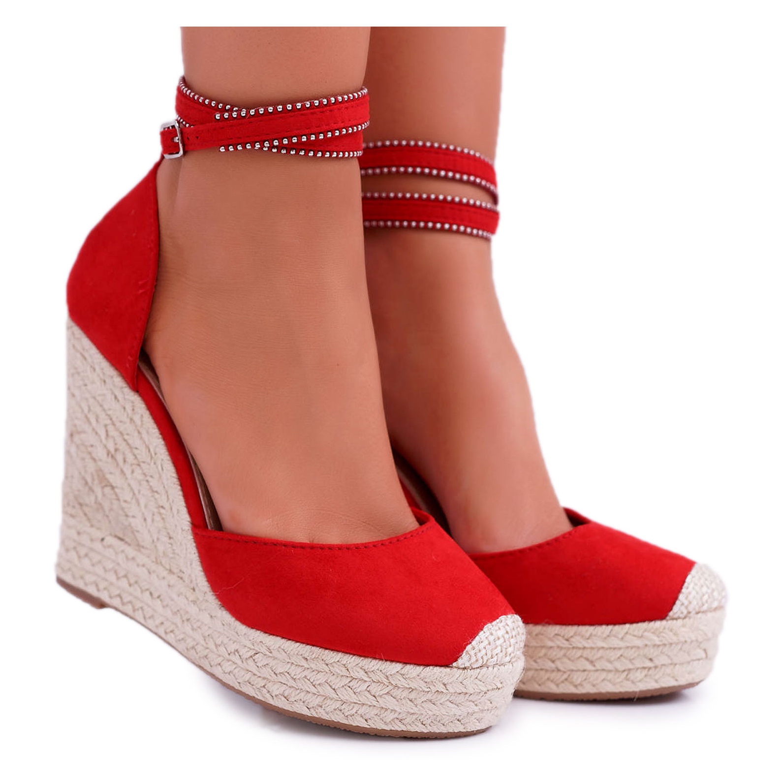 The 12 cm heel height makes this model optically lengthen the legs, while the comfortable wedge means you can enjoy a stylish look without sacrificing comfort. The rhinestones decorating the sandals add a bit of shine, making them easily fit into fashion trends.