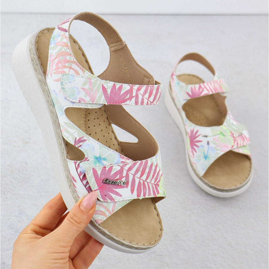 The floral pattern on a white background gives them lightness and freshness, and the sole thickness of 2 cm and 4 cm wedge height ensure comfort for many hours. Made of ecological leather, sandals are not only aesthetic, but also environmentally friendly. The soft ecological leather insert takes care of the comfort of the feet, and the Velcro fastener makes it easier to put on and adapt to individual needs.