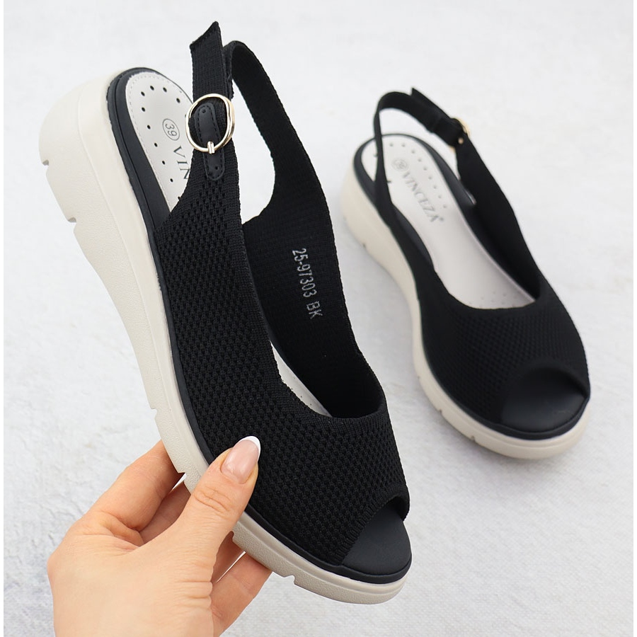 We present women's sandals on a textile wedge in an elegant black color from the renowned Vinceza brand. Model 97303 is a perfect combination of style, comfort and fashion, which will certainly appeal to every modern woman.