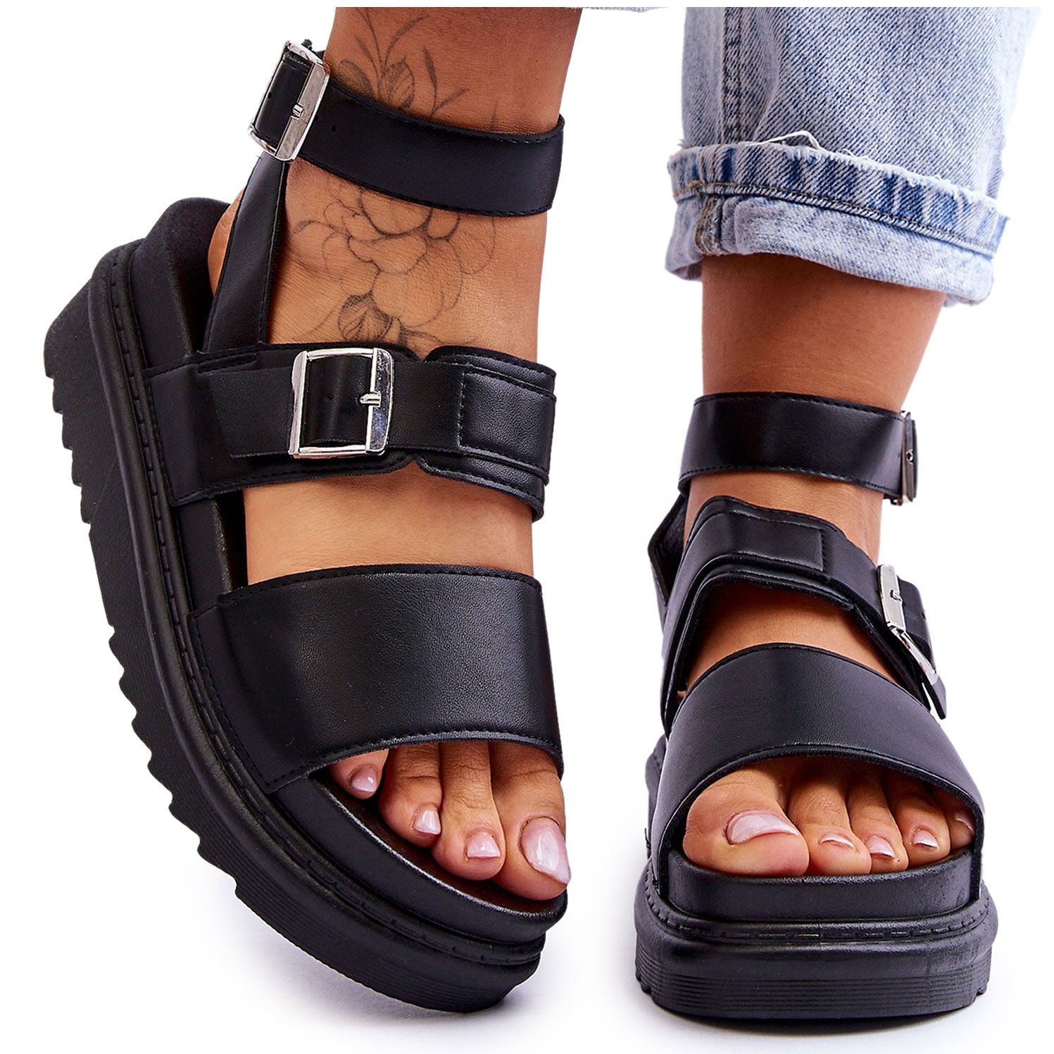 A massive 5.5 cm high platform, also made of plastic, ensures stability and comfort even when worn for long periods of time. The durable black sole is not only functional, but also gives a distinctive look. It is an ideal choice for women who value comfort without giving up fashionable trends.
