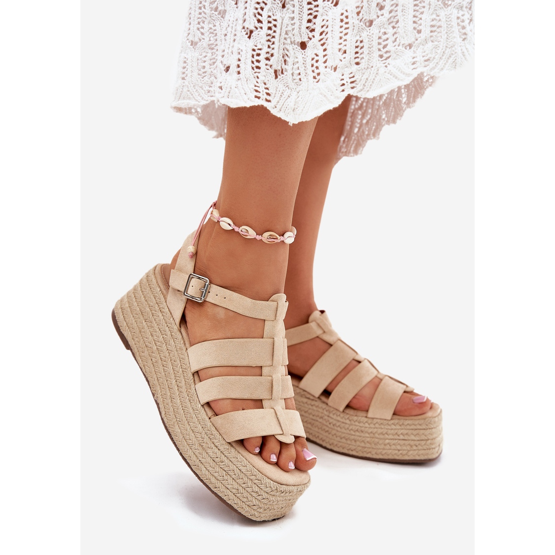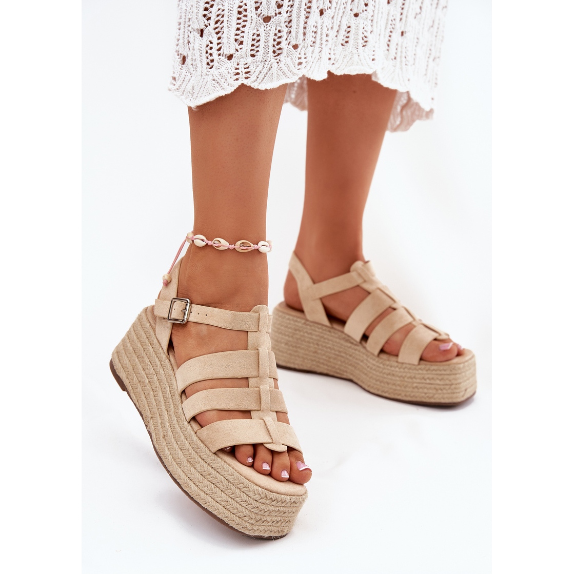 Discover summer elegance thanks to beige women's sandals with stripes and braid. Made of high quality eco suede, these sandals offer not only a stylish look, but also unique wearing comfort. Set on a platform with a delicate 7 cm high wedge, they are an ideal combination of subtlety and stability, which means that you can enjoy every step throughout the day.