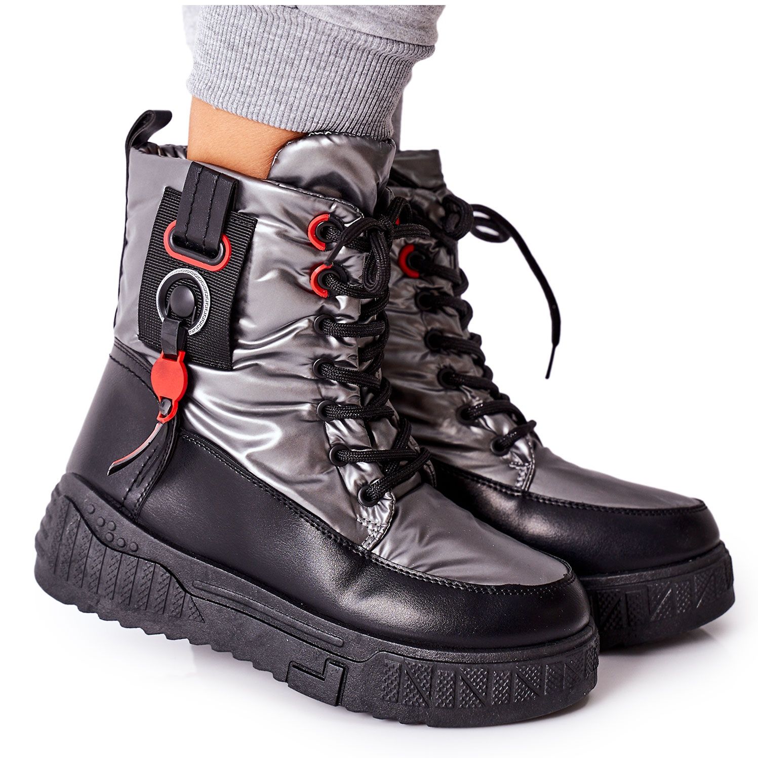 The 17 cm upper height and 3 cm flat platform make the boots comfortable for everyday use. Due to the increased numbering, we recommend choosing a smaller size, which will allow for a perfect fit to the foot. In a rich black and gray color scheme, these trappers will fit perfectly into any winter styling.