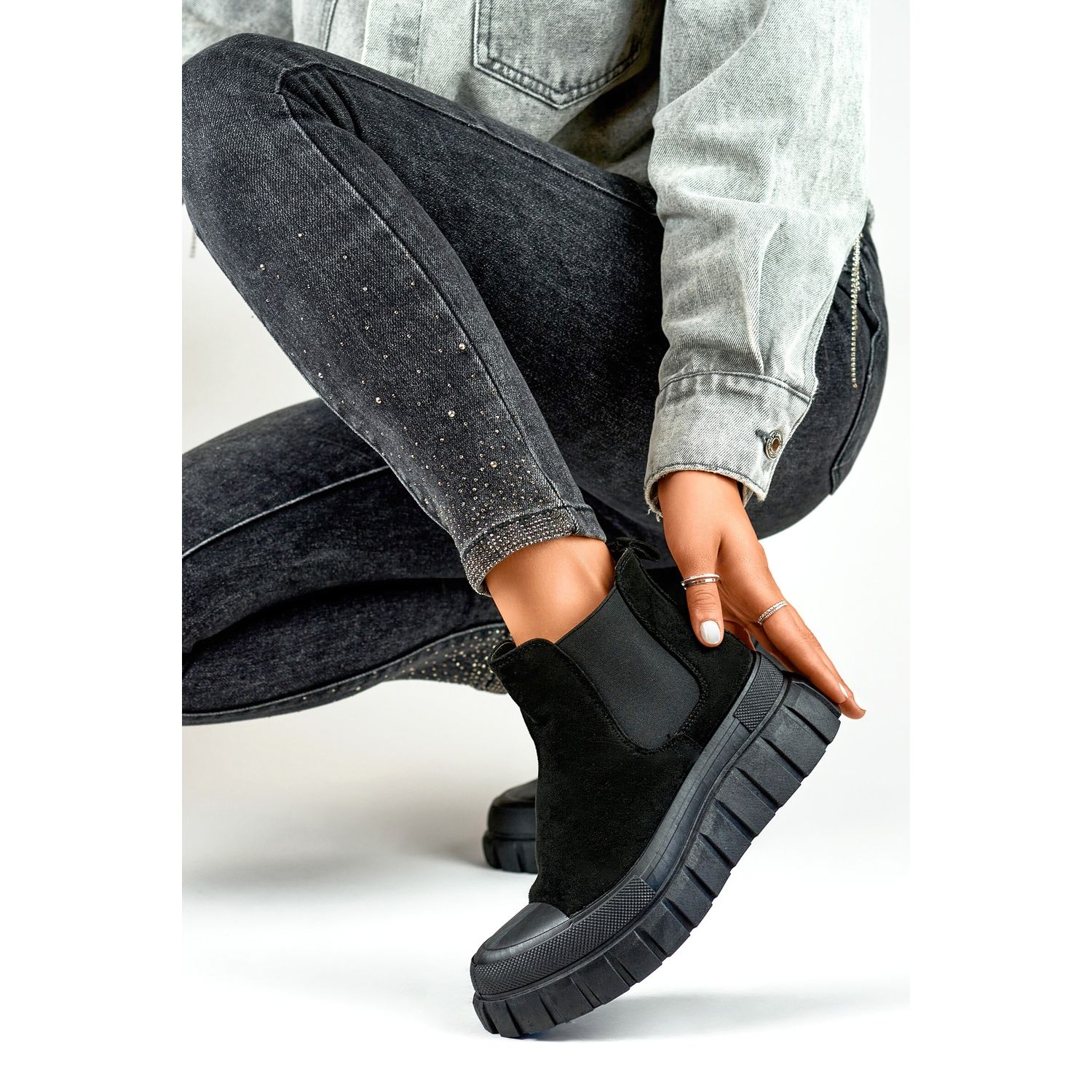 The height of the upper 10 cm makes them reach slightly by the ankle, which further emphasizes their fashionable character. Sewn from ecological suede leather, they are an environmentally friendly solution, and at the same time invariably stylish.