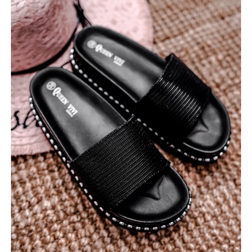 Women's slippers on the Venima platform - a combination of comfort and modern style. A black, light plastic sole with subtle, silver details adds character, and a decorative strap with metallic stitching catches the eye. Slipped model, without insulation and without a heel, perfect on a daily basis.