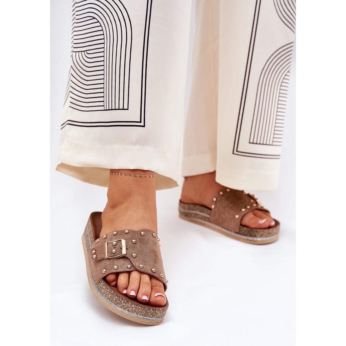 Details: Women's slippers on the platform with a buckle and khaki studs beige