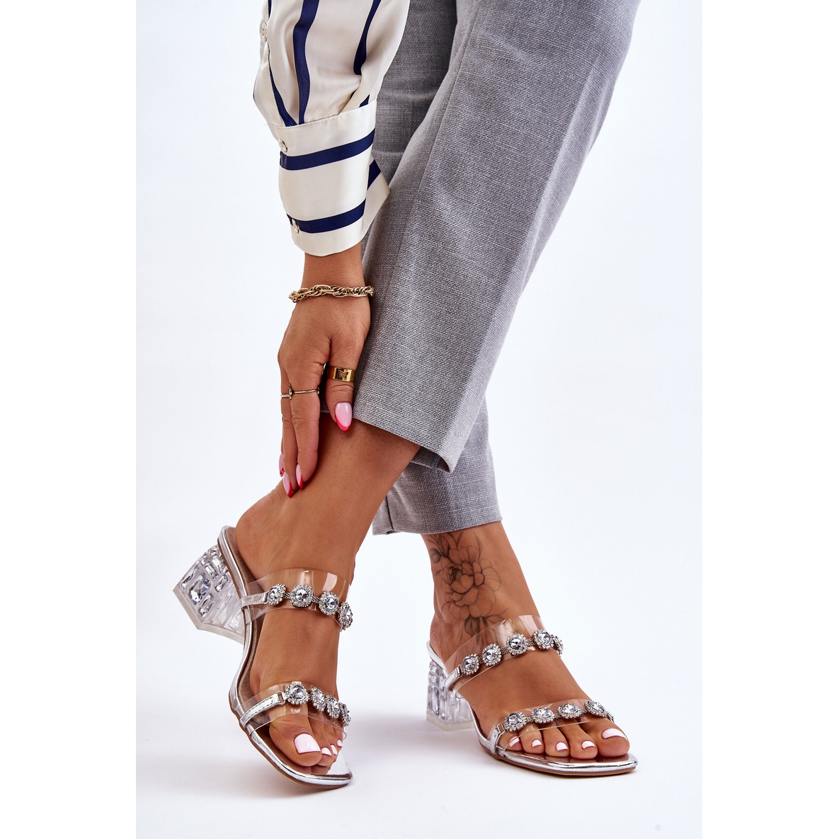 Women's S.Barski Leyla flip-flops in silver are an elegant and fashionable choice for spring and summer days. Made of high-quality plastic and eco-leather, they combine style and comfort. The model is set on a solid block heel, which is 5.5 cm high, providing stability when walking.