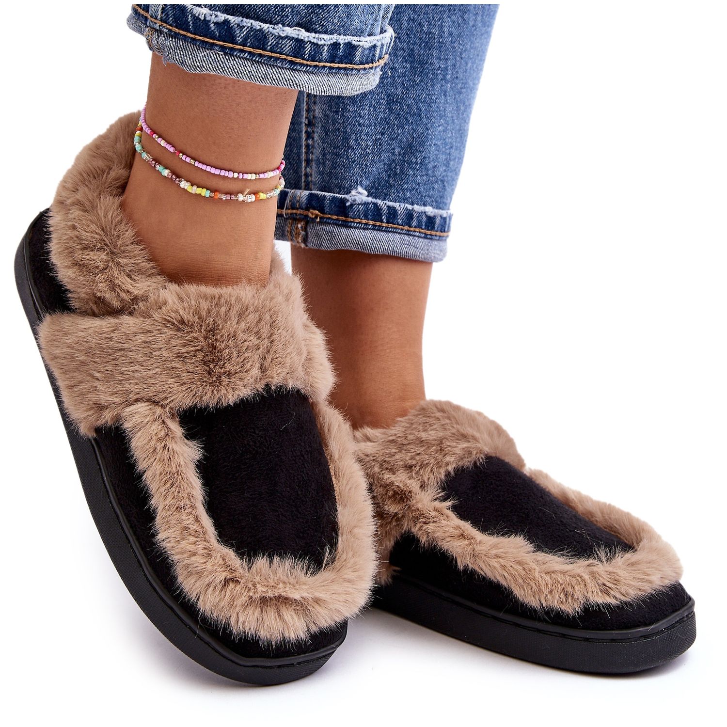 The stylish black color and the additional accent of beige fur make these slippers the perfect complement to your home outfit. Moreover, the elegant eco-suede finish makes this model stand out from other products available on the market.