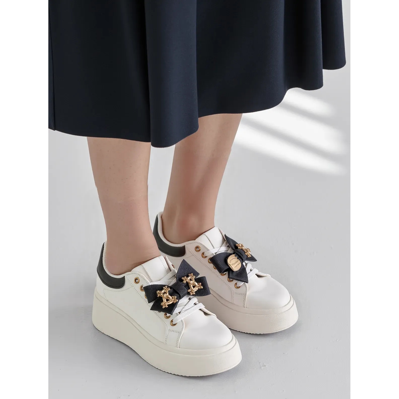 Women's Sneakers Charm Black in black is a proposal for women who value the combination of elegance with comfort every day. These unique shoes are distinguished by white colors and decorative details, such as a spectacular bow and subtle golden accents that give them originality. Made of high quality ecological leather, they provide convenience and durability for long hours of use.