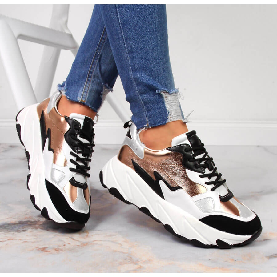 Women's sneakers Potocki-white and gold platforms that will change any stylization. The elegant and at the same time sporty cut combines comfort with a fashionable look: a soft, textile lining and ecological leather insert ensure comfort from the first assumption, and the decorative platform emphasizes the figure and adds a few centimeters without giving up convenience.
