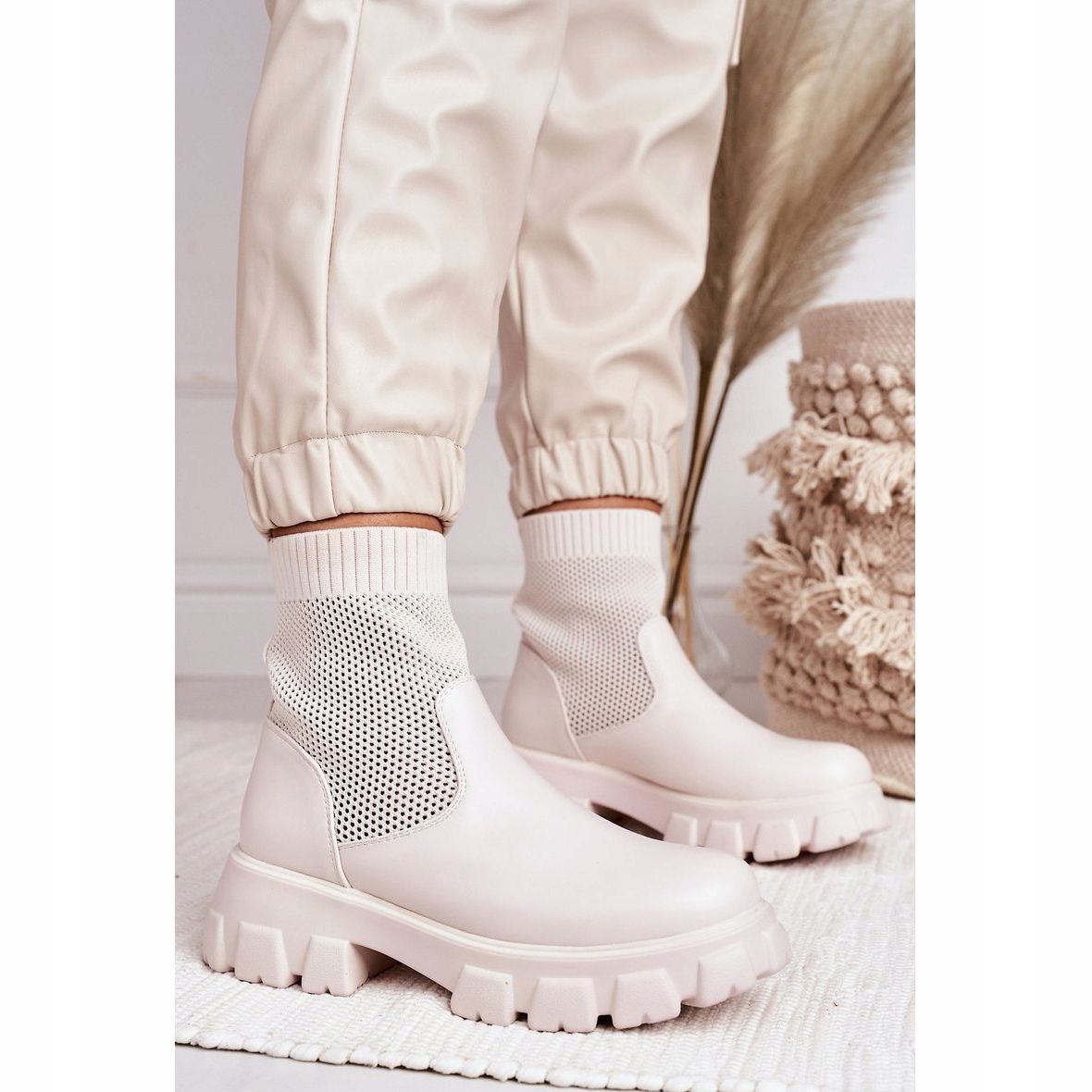 Discover Women's Sock Boots Workers White Stormy - the perfect combination of style and comfort for every occasion! These unique platform boots are distinguished by a soft openwork upper that perfectly adapts to the foot, providing freedom of movement. The massive, synthetic sole not only emphasizes the modern design, but also guarantees stability and comfort when worn.