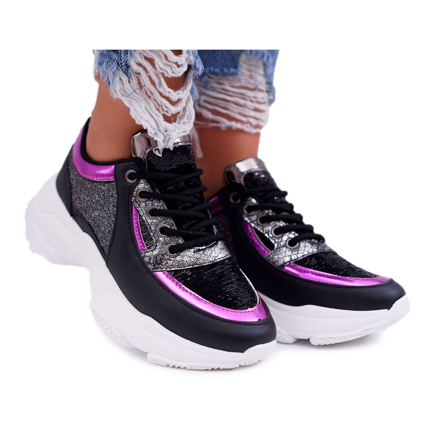 Sports Women's Shoes Thick Sole Glitter Black Ranea gray are the perfect choice for women who value original style and everyday comfort. They are characterized by a unique design that combines a fashionable sports cut and effective glitter inserts. Thanks to the thick sole with a height of 5 cm, these shoes not only add the right height, but also provide comfort with every step.