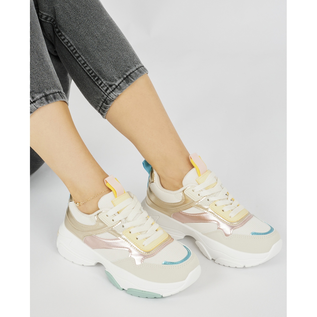 The model in shades of gold and white is distinguished by a metallic finish, which makes every stylization gain a new glow. Thanks to the round toe and full fastening on the laces, the shoes are not only comfortable, but also perfectly adapt to the foot.
