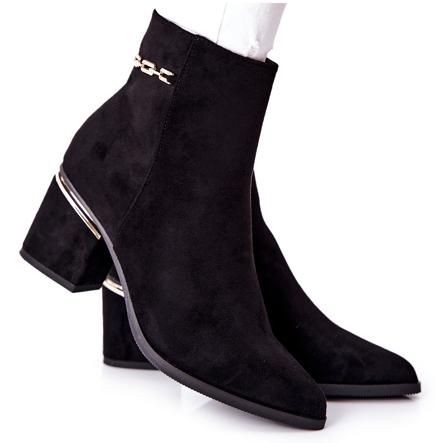 Made of high-quality ecological suede leather, these boots stand out not only for their modern design with an almond toe, but also for the gold decoration on the post, which adds a unique character to them. Thanks to the practical zip fastening placed on the side, putting on the shoes becomes quick and easy.