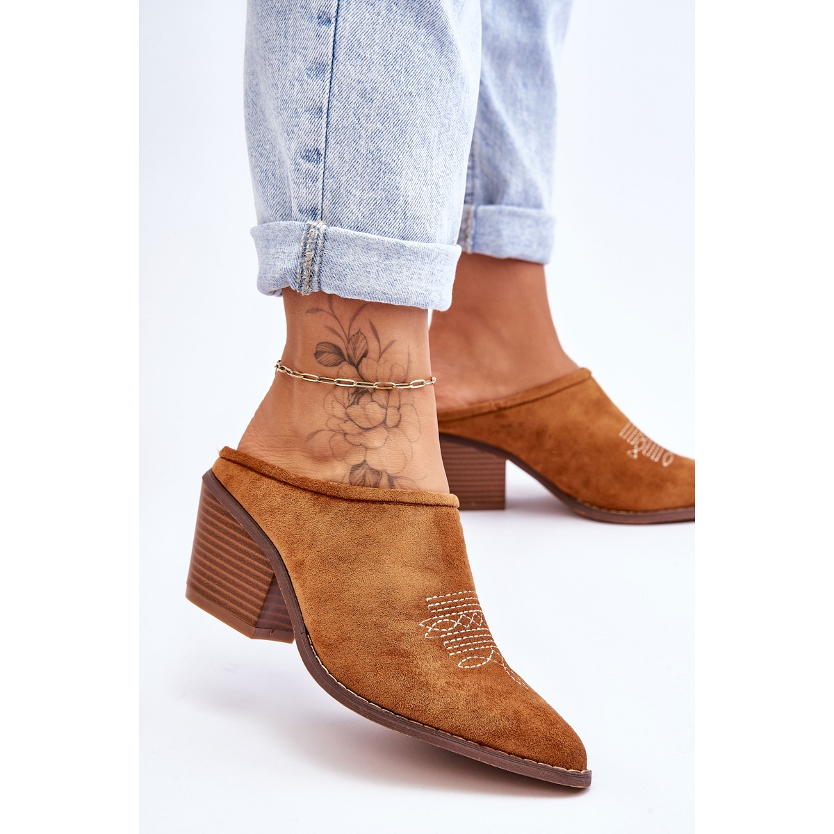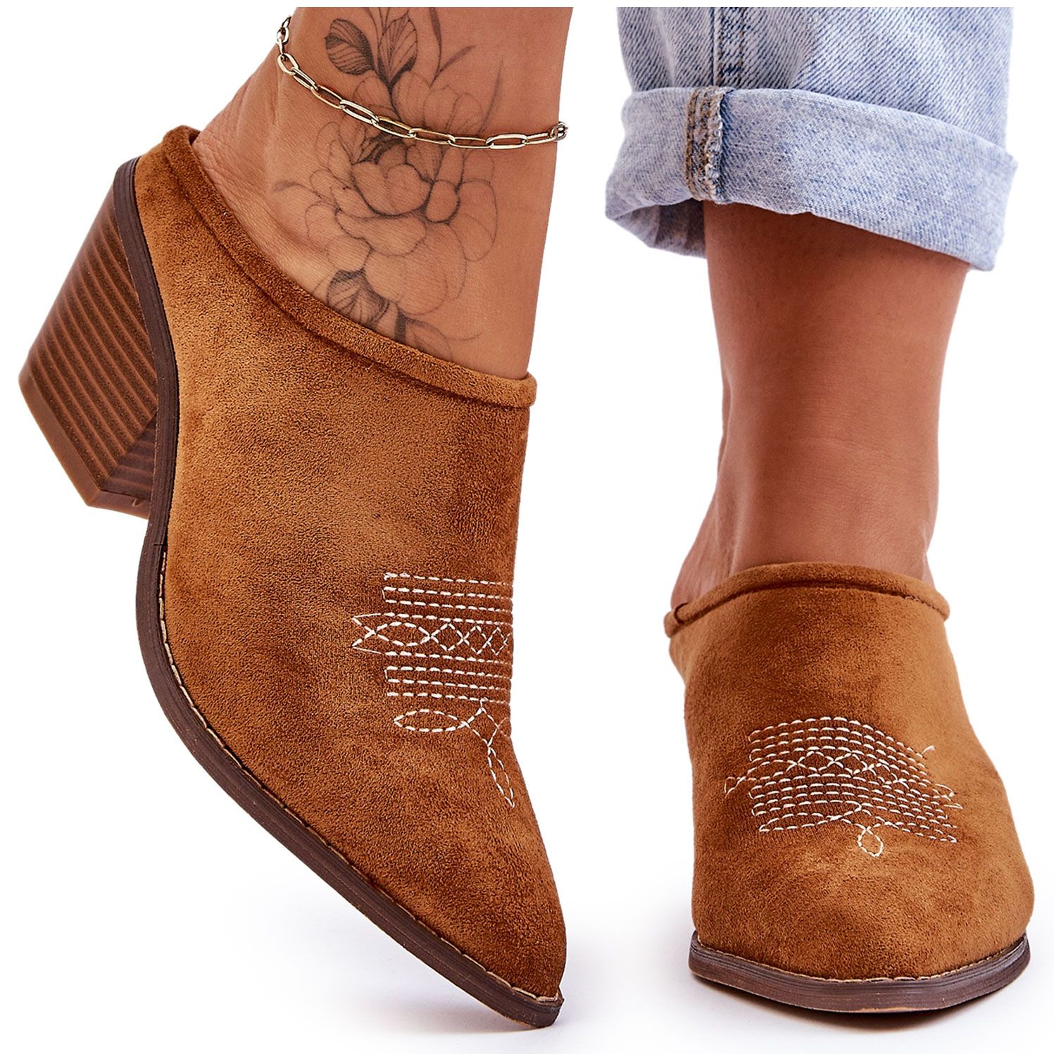 We present the BM cowboy mules in a shade of camel, which are the perfect complement to any casual style! Made of high-quality eco-suede, they look incredibly stylish thanks to the embroidered pattern on the front. The classic pointed toe and massive 6.5 cm block heel make this model not only elegant, but also very comfortable.