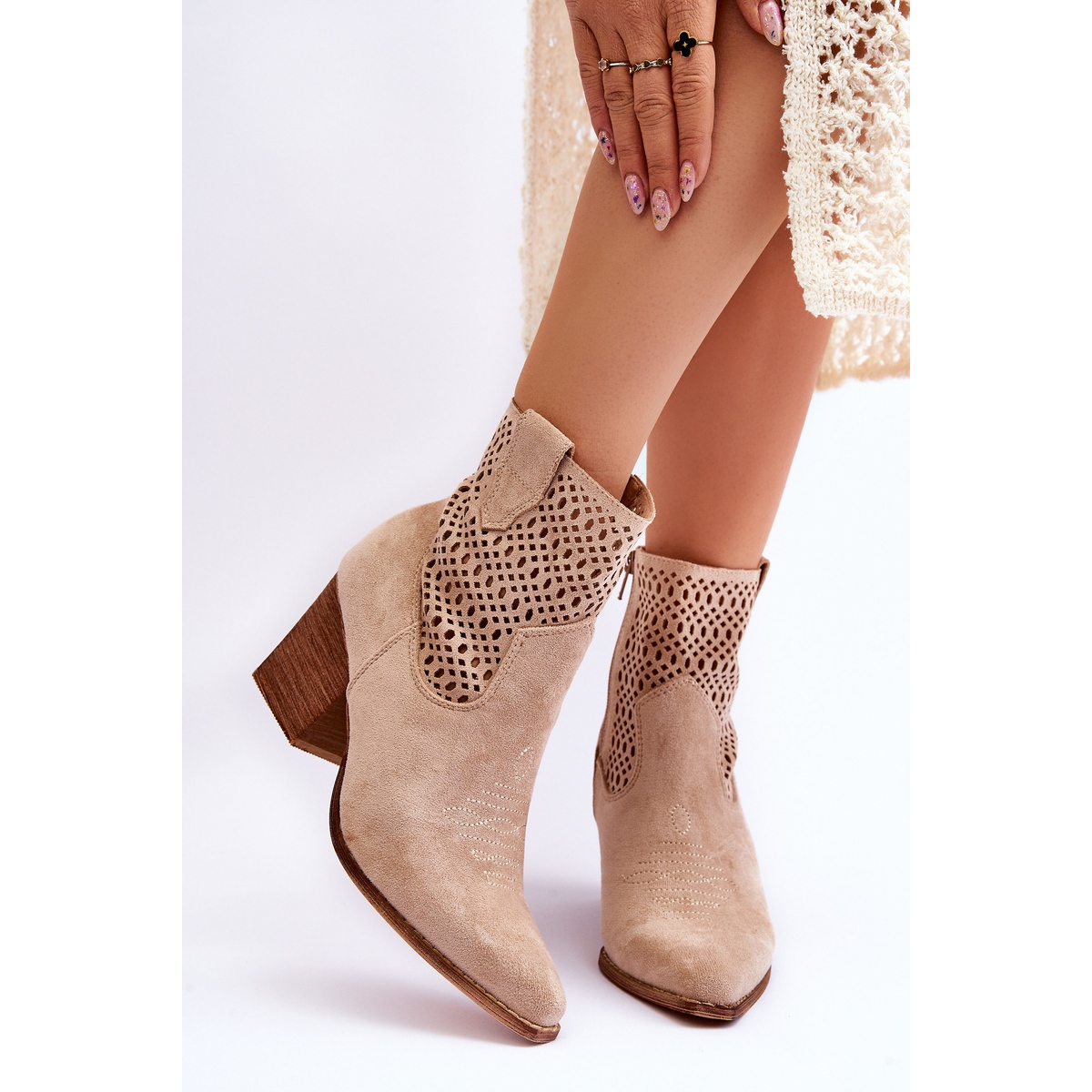 Discover the extraordinary women's suede cowboy boots FB1, which perfectly combine classic style with a modern finish. These beige ankle boots with a block heel are the perfect choice for every woman who wants to stand out from the crowd. The ankle-high upper is made of ecological suede, decorated with an openwork pattern and subtle stitching on the front, which gives them a unique character.