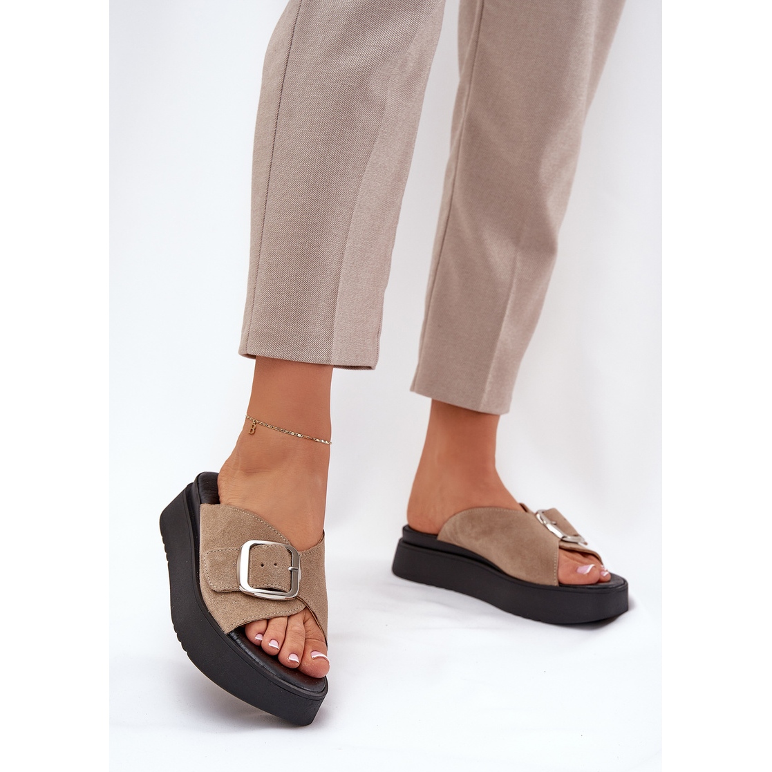 Details: Women's suede flip flops with a buckle on the Zazoo 3019 beige platform