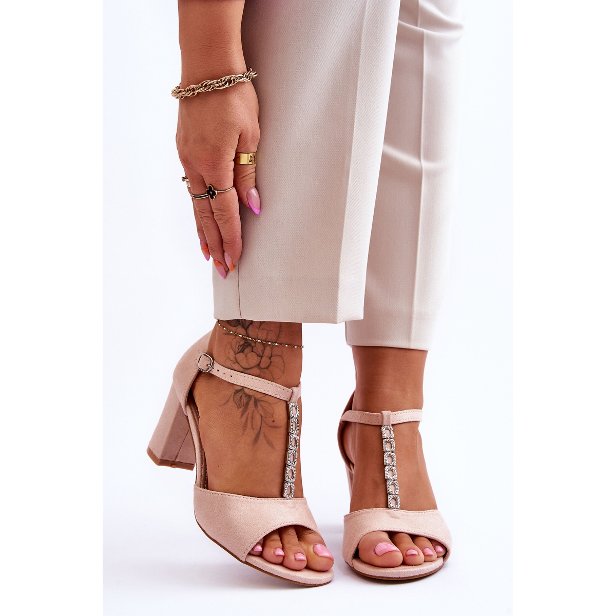 Made of high-quality eco-suede, the sandals have subtle straps decorated with rhinestones that effectively imitate zircons, adding class and shine to them. The adjustable strap with a buckle and a stiffened heel provide excellent fit and stability, which means you can enjoy them all day long without worrying about discomfort.