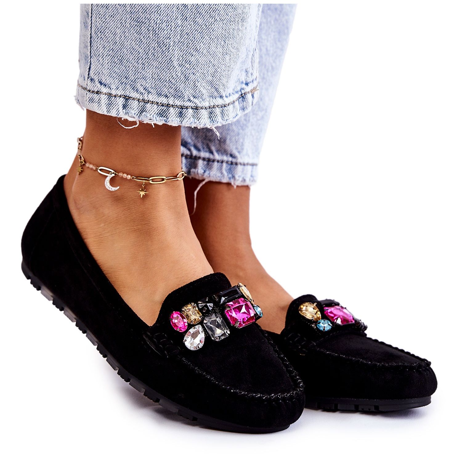 Stylish and comfortable - these are the Women's Suede Moccasins With Decorations Janetta in black. Made of high-quality eco-suede, these moccasins provide not only comfort of wearing, but also an elegant look. Decorative stones on the front add a unique charm, making them ideal for many different styles.
