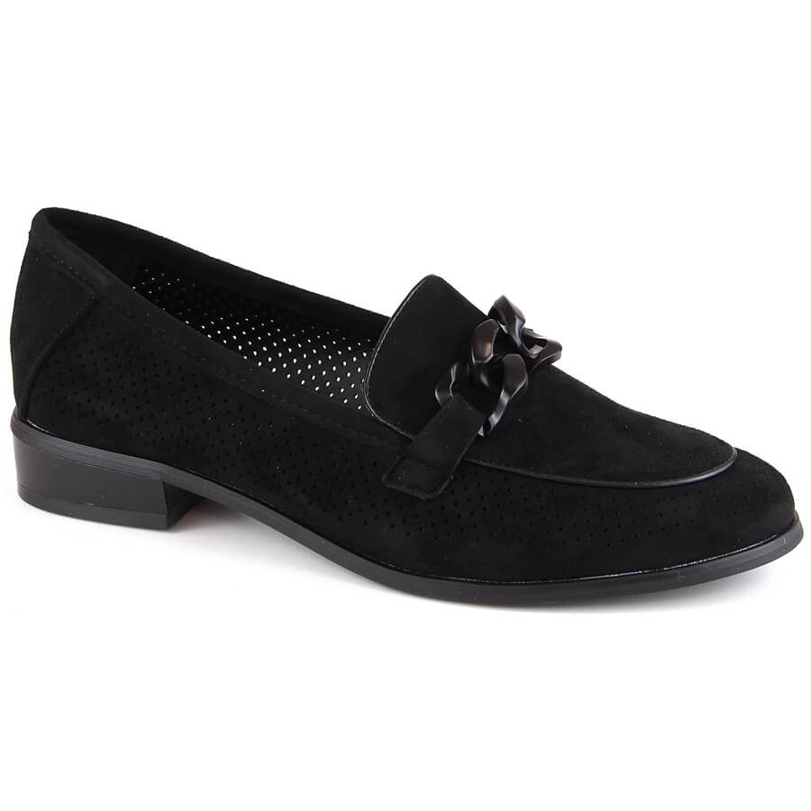 Suede women's openwork heeled loafers black Potocki SZ12052 are an ideal proposition for women who value elegance and comfort every day. These stylish loafers from the renowned Potocki brand combine modern design with high quality workmanship.