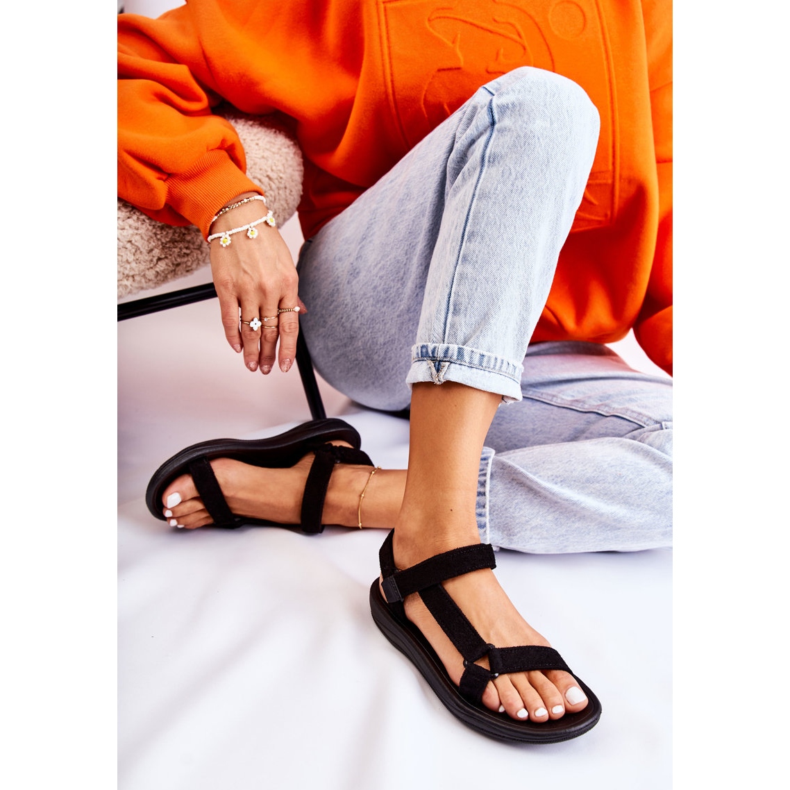 PM1 Women's Suede Sport Sandals Black Harris is a light and comfortable footwear for warm days. Their sporty look is perfect for holiday trips or city walks. These sandals are black, fastened with velcro, which allows a perfect fit to the leg. The straps are made of suede ecological leather, which gives them an elegant look. The sole, made of rubber material, ensures wearing comfort. This model has a delicate platform with a height of 2.5 cm, which will ensure comfort during walks. Sandals do not have a toe cap and the insole is made of plastic.