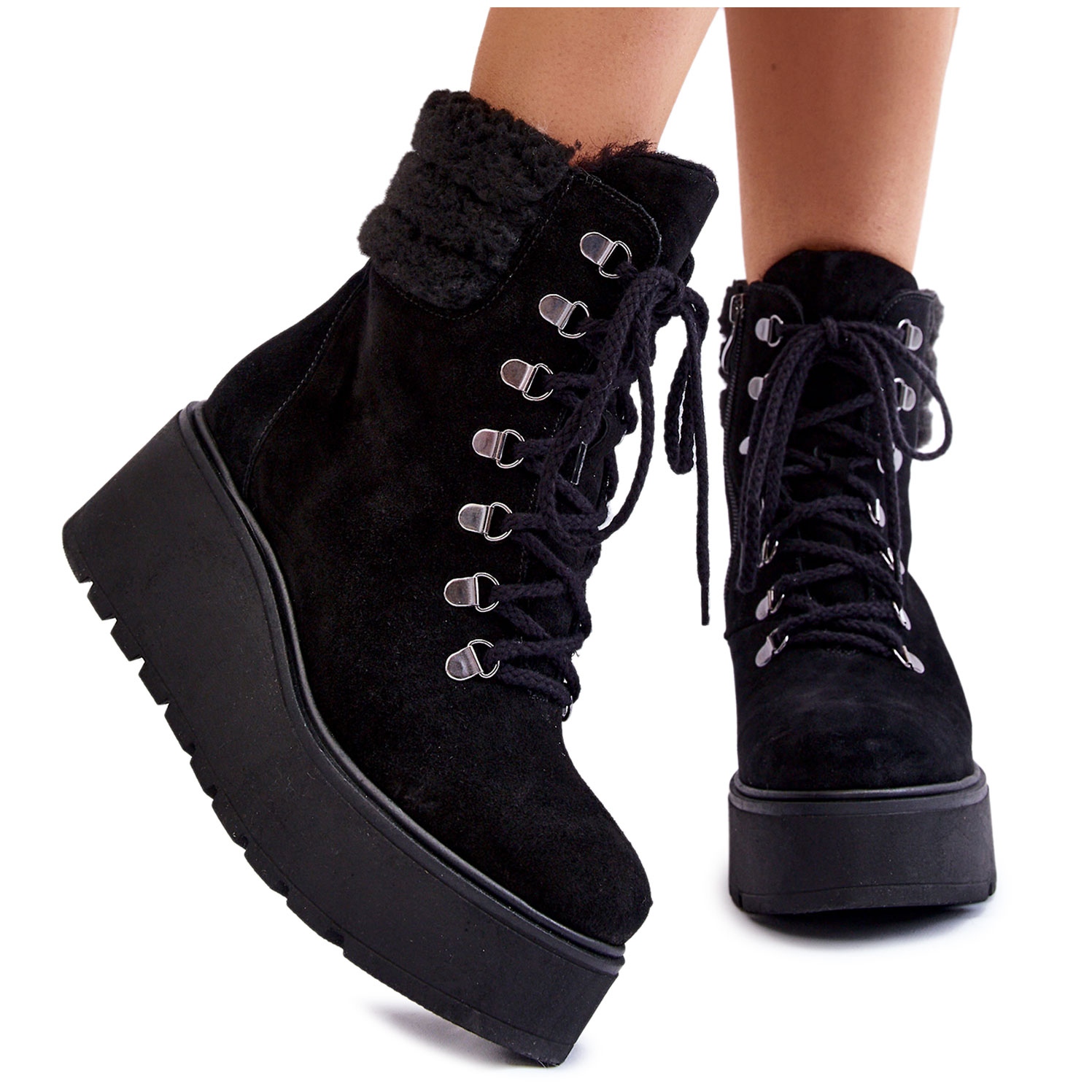 Classic and at the same time fashionable - black Meniko boots are made of natural suede leather, with attention to detail and comfort of use. The model combines practical solutions (slider + lacing) with a solid construction: a massive platform and a wedge give the figure lightness, and insulation of natural wool provides heat on cooler days.