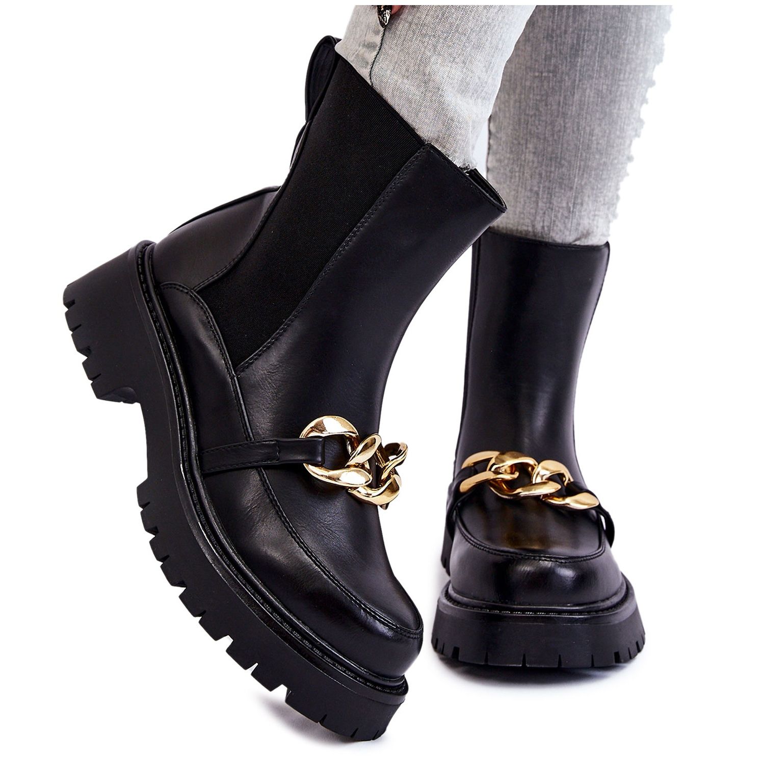 One of the most important elements of this model is the spectacular chain on the front, which adds an original character to the whole. The boots are set on a flat 5 cm heel and a sole with grooves, which ensures stability and safety when walking. Their minimalist black color makes them a great match for various styles, both everyday and more formal occasions.