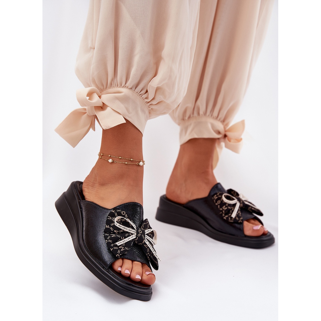 The model embedded on a stable wedge with a height of 5 cm guarantees comfort of wearing all day, and the design with the bow gives them a subtle charm that catches the eye. Slippers are available in a classic black color, which makes them perfectly blend with various summer outfits.