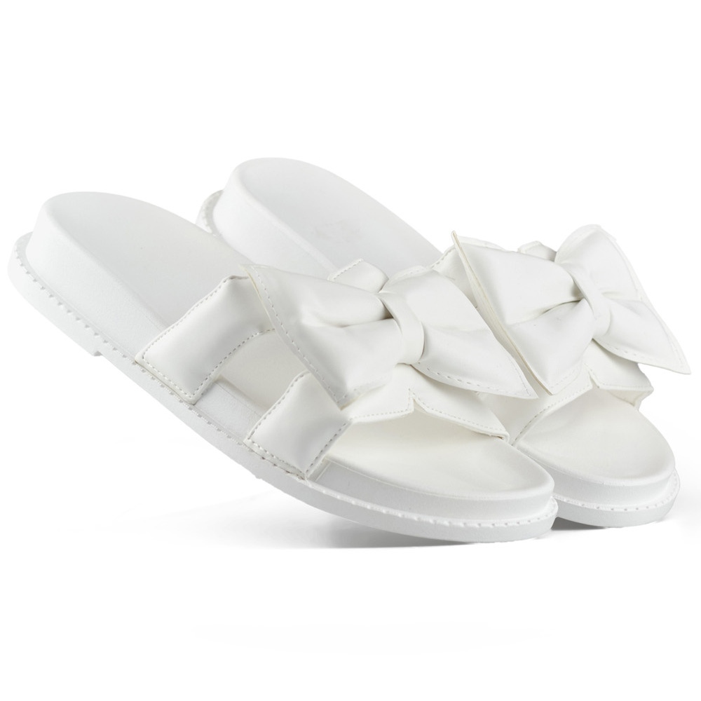 Details: Women's white flip-flops with a bow, made of eco-leather