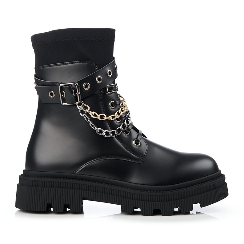 We present unique women's work boots with chains by Shelovet, which will delight every lover of fashionable and comfortable shoes. Made of high-quality ecological leather and textile material, these black ankle boots combine elegance and rock style, perfectly fitting into a casual look for every day.