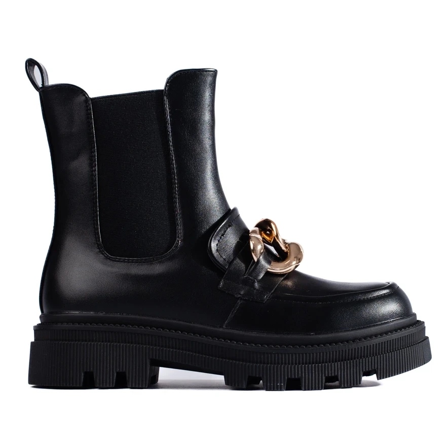 Black workers on the platform are practical and fashionable boots that provide comfort thanks to warming and soft fastening. Organic leather gives the effect of elegant appearance with easy care, and the sole with the tread guarantees good adhesion in urban conditions. The golden chain adds character and emphasizes the fashionable nature of the footwear. The side zip fastener makes it easier to put on and take off.