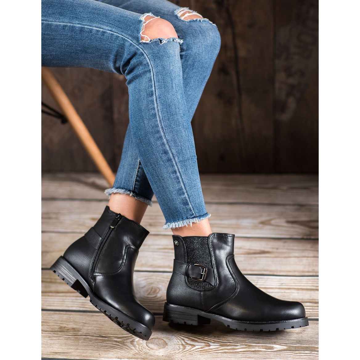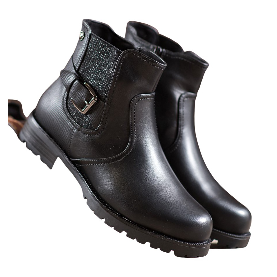 These boots have a shaft reaching below the ankle, which adds a fashionable character to them. The decorative strap with a buckle is an element that distinguishes Gogo Workery from other models, introducing a note of rock style to the styling. Thanks to the simple, black color, they match both casual and more elegant outfits.