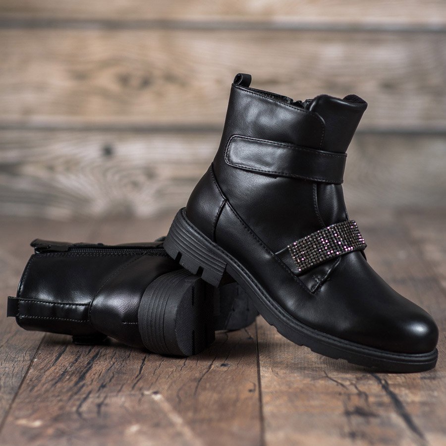 We present Evento Workery shoes with Crystals in black - a perfect combination of rock style and elegance. These extraordinary low-heeled ankle boots will surely attract the attention of every self-confident woman who values exceptional design and comfort of wearing.