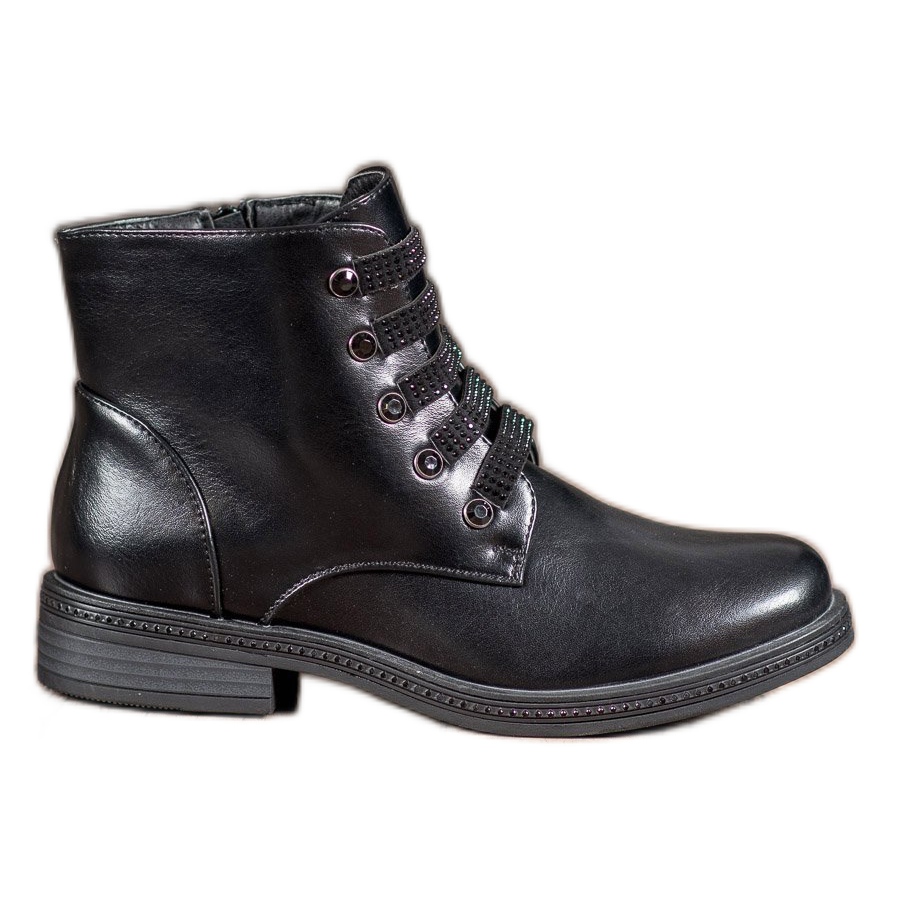 Made of high-quality eco-leather in an elegant black color, Workers perfectly match a variety of outfits, from casual to more elegant. High lacing and additional fastening provide stability, and a soft heel counter increases comfort. Minimalist design with a round toe, emphasized by subtle crystals and rhinestones, gives them a unique character.
