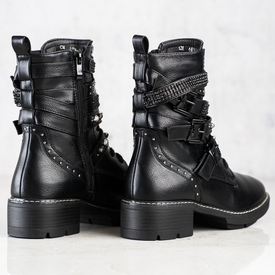 Decorative elements such as a buckle, rhinestones and a belt give the shoes character and uniqueness, perfectly fitting into current fashion trends. Workers are closed with a zipper and laced, which makes them easy to put on and adjust to the leg.